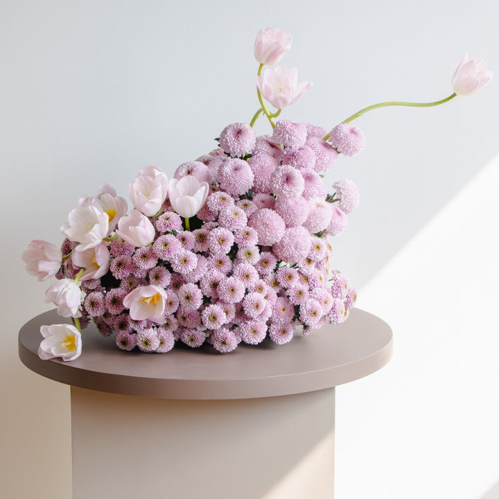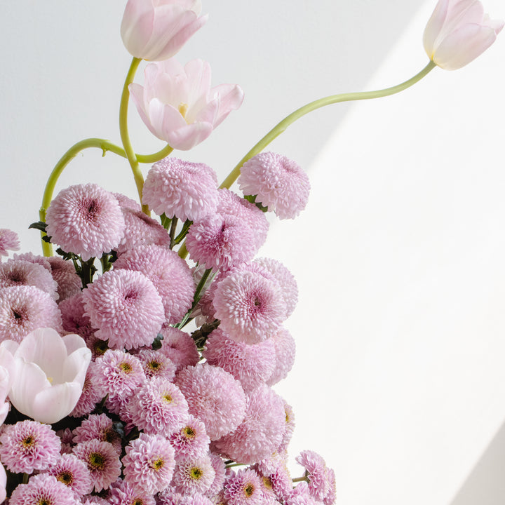 A magnificent statement bouquet that celebrates romance and abundance. With lush chrysanthemums and delicate pink tulips, this extra large arrangement radiates sophistication and is designed to impress at life’s most memorable moments.