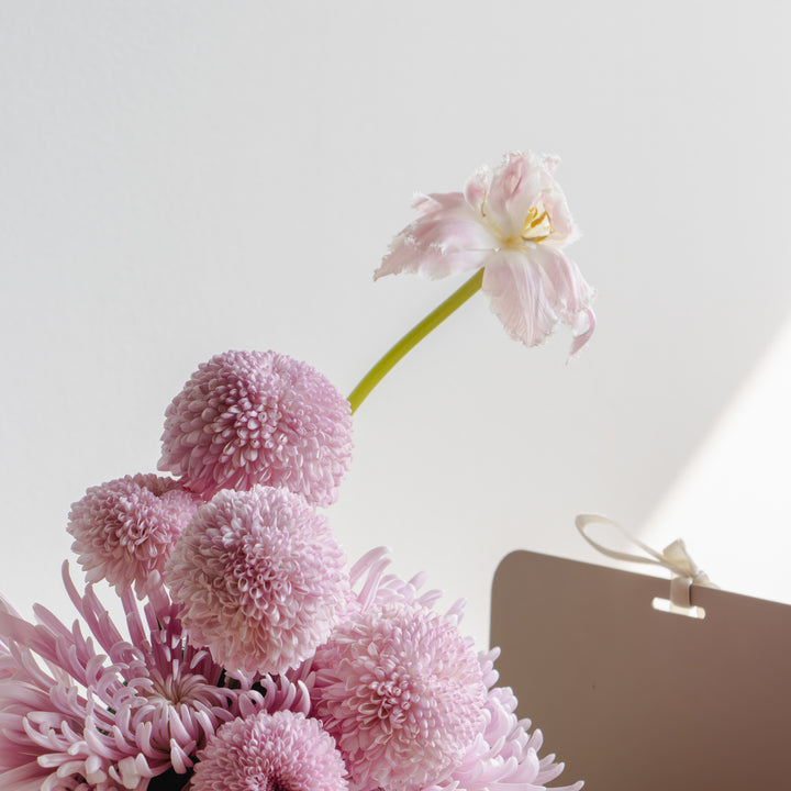 A tender balance of pink tulips and soft chrysanthemums, this arrangement is designed to embody romance, joy, and grace. Perfect for intimate celebrations, heartfelt gifting, or as a refined accent in the home.