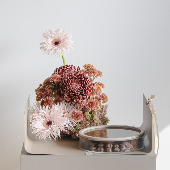 | Tray with Arrangement & Chocolates | A statement of indulgence—where exquisite florals meet fine chocolates, beautifully presented on a Bend Tray. | Chocolates are included. |