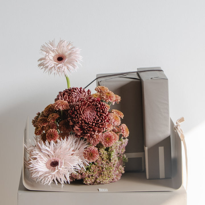 | Arrangement with Tray | Presented on a refined Bend Tray, this arrangement enhances the blooms with sophisticated presentation, perfect for gifting. | - |