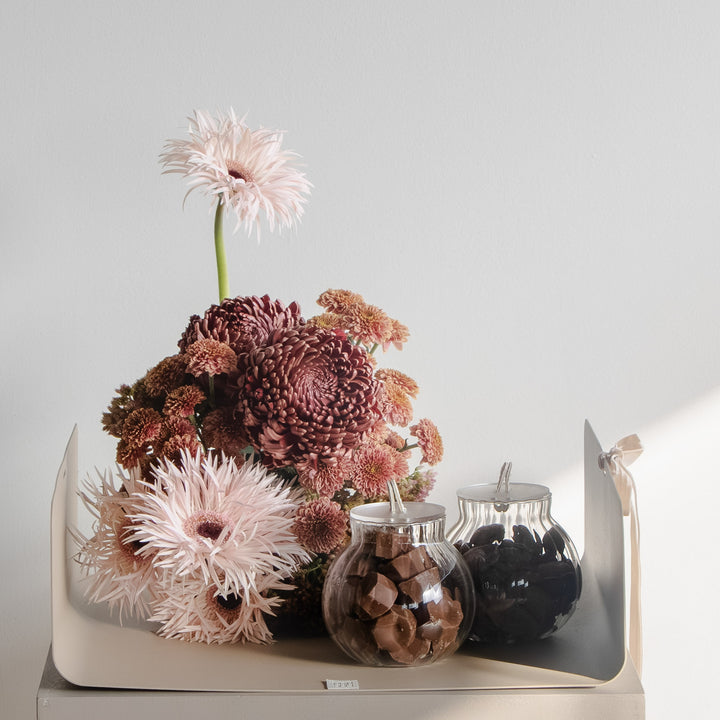 | Arrangement with Tray & Jars | A luxurious pairing of blooms with artisanal jars, blending beauty with function in a graceful display. | Chocolates are not included. |