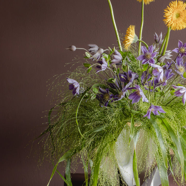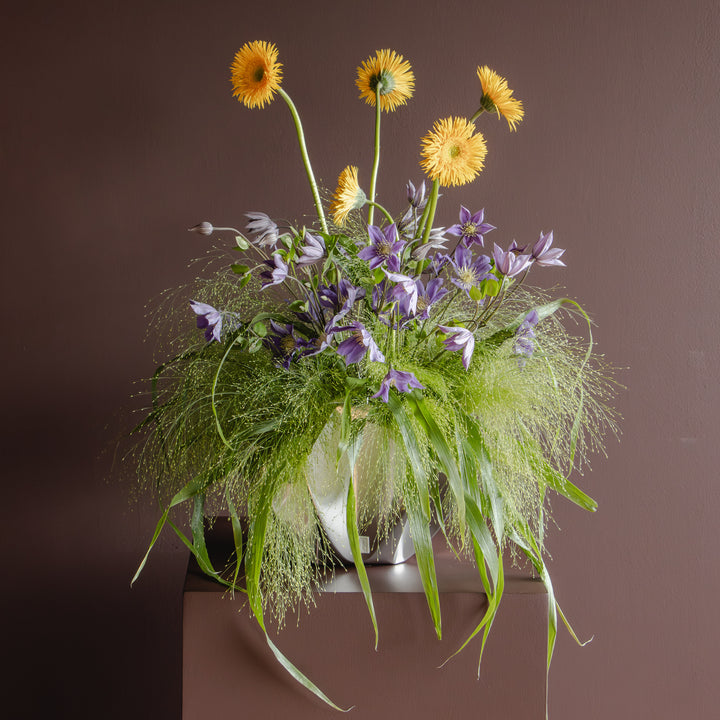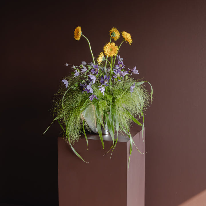 Vibrant yet graceful, this arrangement highlights cheerful blooms and lush greenery in a sculptural Arumi vase. A lively statement piece full of texture and movement.
