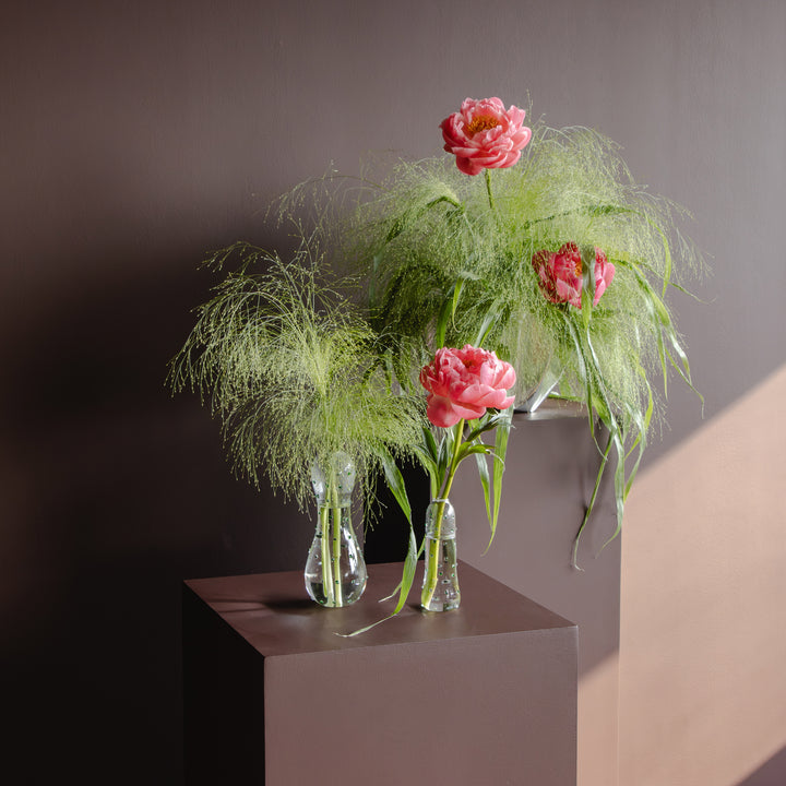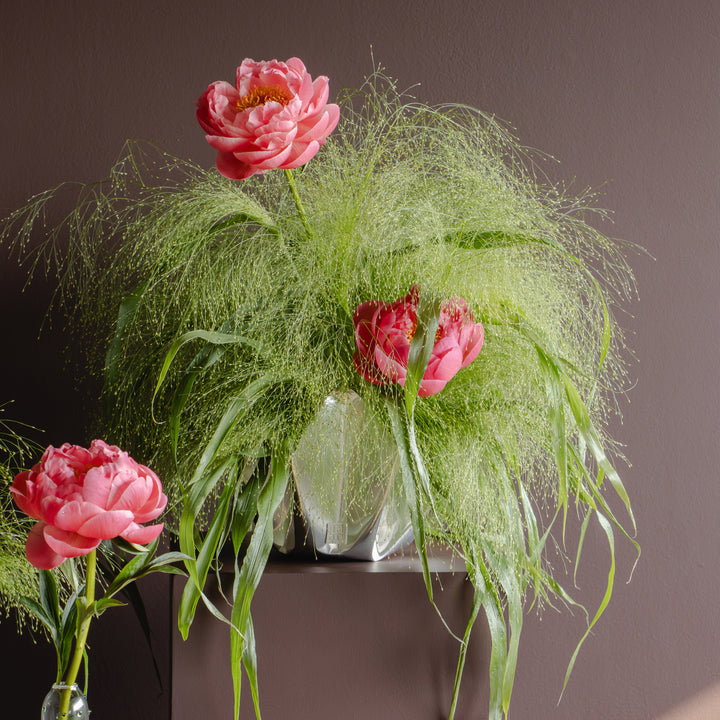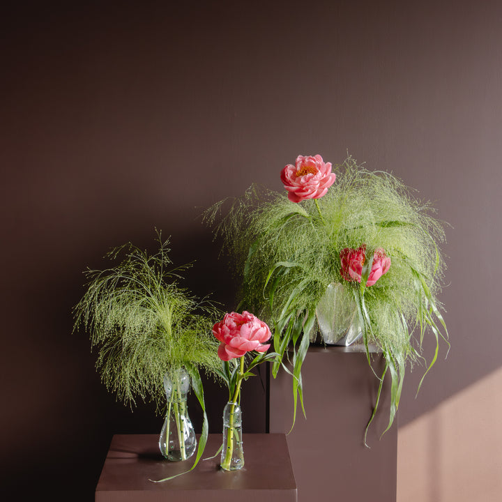 A curated mix of modern vases with lush peonies and light florals, creating a refined decorative set ideal for gifting or elegant table styling.