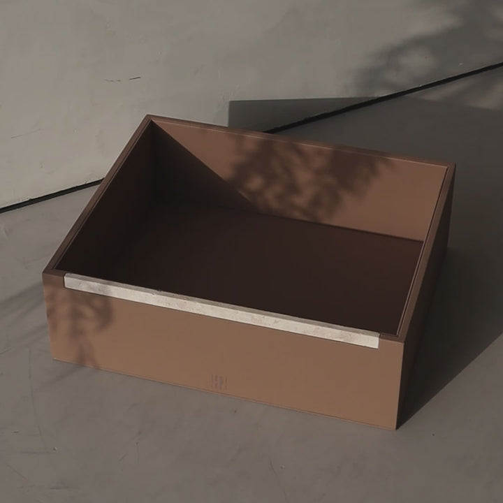A generously sized tan storage box, ideal for keeping essentials beautifully arranged.
