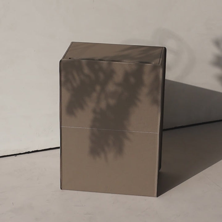 A striking storage piece in deep umber, designed to keep laundry discreetly contained with modern style.
