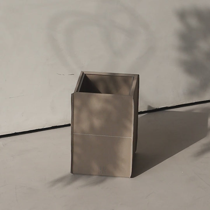Crafted for both elegance and utility, the ecru leather bin is a subtle yet sophisticated waste solution.