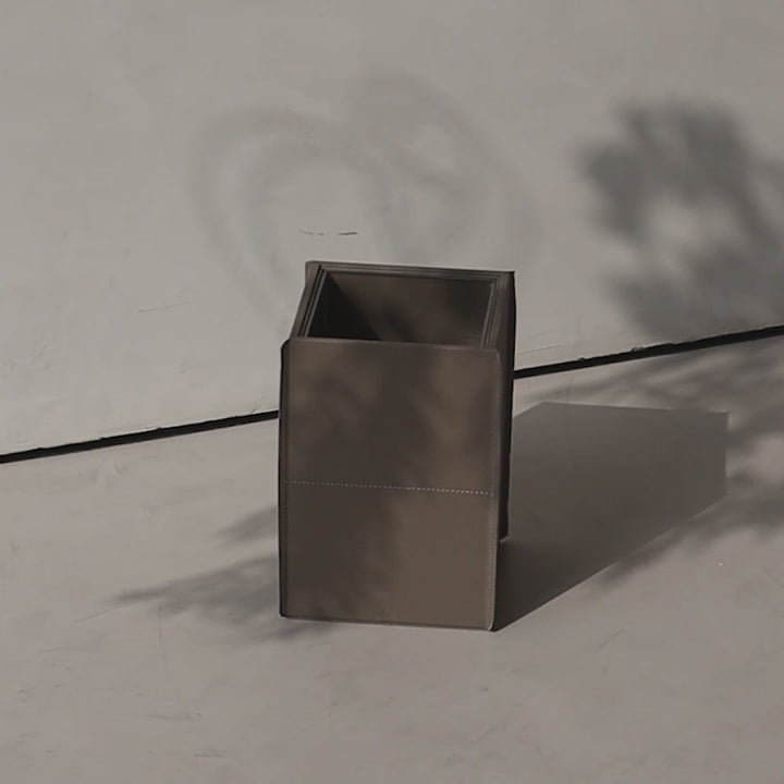 In rich umber leather, this bin turns a simple necessity into a refined design feature.