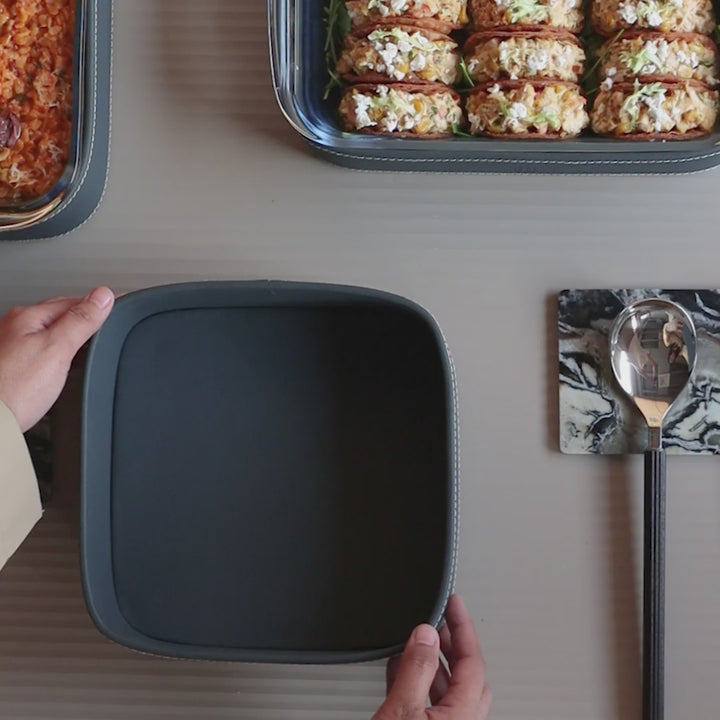 A complete trio in deep Midnight Navy, crafted to bring modern refinement and timeless luxury to your home. Each piece is hand-finished with textured leather, offering a sophisticated balance of form and function. Perfect for curated tabletops, gifting, or elevating everyday hosting with a bold yet understated statement.