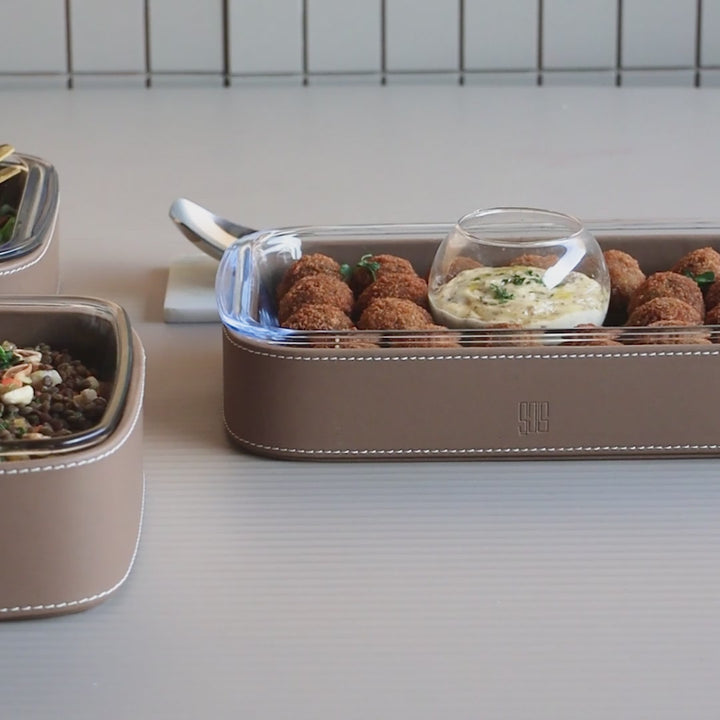 A refined trio crafted in warm Tan leather, the Leatheryx Serveware Set brings effortless elegance to dining and home styling. Each piece features clean lines, a soft matte texture, and artisanal finishing—perfect for elevating everyday hosting or gifting with timeless sophistication.