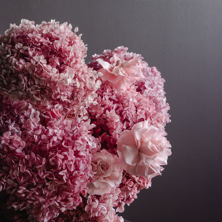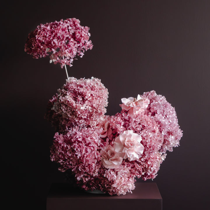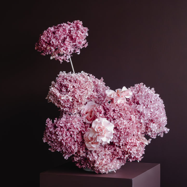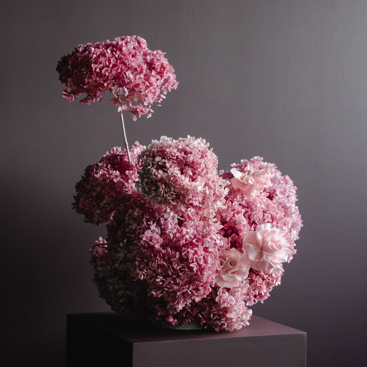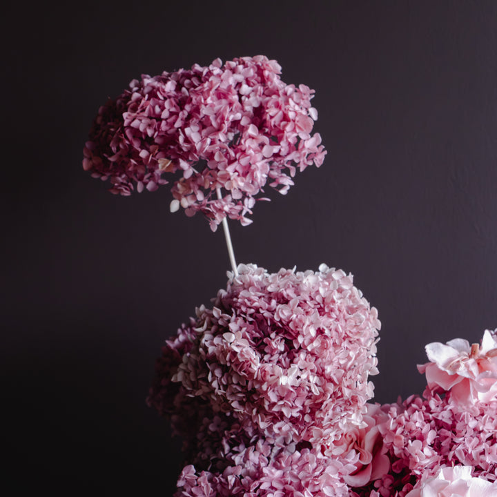 Rising with sculptural grace, this tall floral tower blends infinity roses and preserved hydrangeas on a sphere pedestal, offering a dramatic display designed for premium spaces and elegant celebrations.