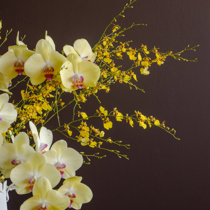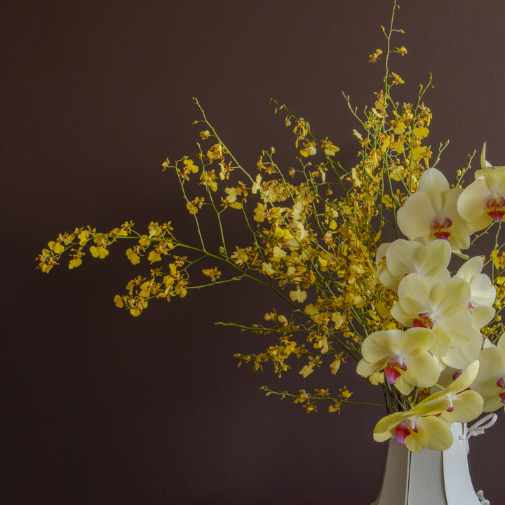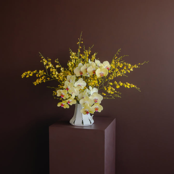 Modern and artistic, this vase highlights golden orchids and sculptural blooms in a refined Shibui silhouette. Perfect for chic homes and contemporary spaces.