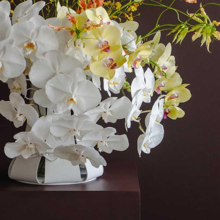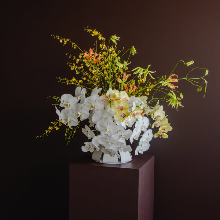 A dramatic, full-scale floral display featuring bold Gloriosa and elegant orchids. Designed for true floral connoisseurs, this statement vase elevates any space with luxury and character.