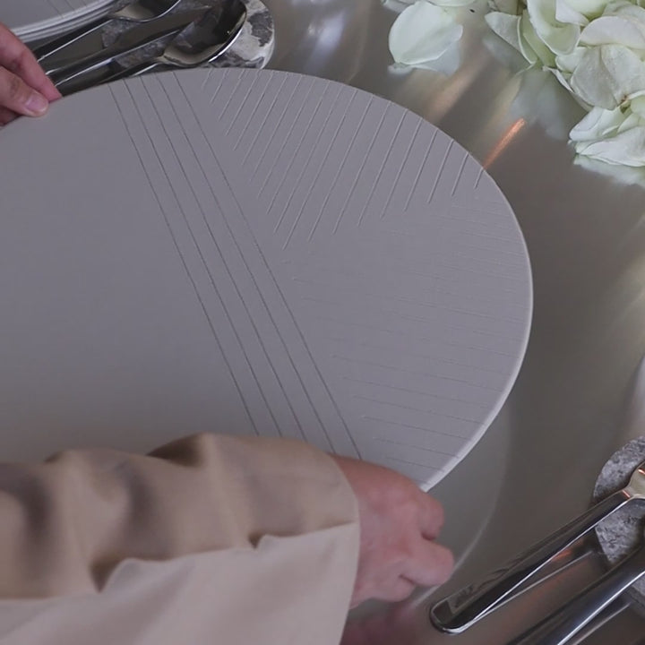 Minimalist and serene, the light beige placemat with line detailing adds quiet refinement to the table.